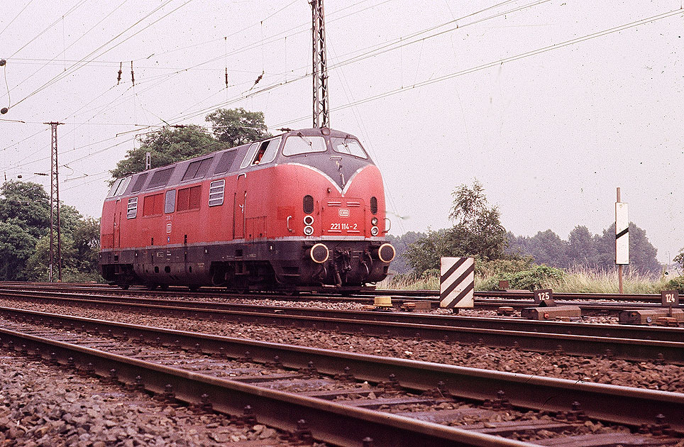 Die 221 134-0 am 14. Juli 1986 in Duisburg. Im Ruhrgebiet war das letzte Einsatzgebiet der Baureihe 221 zum Aufnahmezeitpunkt war die 221 134-0 im Bw Oberhausen-Osterfeld beheimatet. Die Lok wurde als V200 134 im Jahr 1965 von der Deutschen Bundesbahn in Betrieb genommen und von Krauss Maffei mit der Fabriknummer 19254 geliefert. Dia 1546 Foto CD Zusammenfassung Foto: Lars Brüggemann |