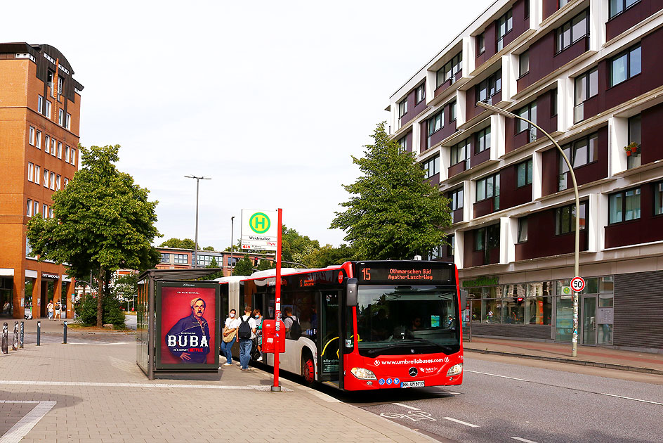 Die Mobilitätswende in Hamburg: An der Haltestelle Weidenallee hält der Umbrella-Bus 1737 als Buslinie 15 (vormals 115) von der Alsterchaussee nach Othmarschen Süd Agathe-Lasch-Weg. Am Wartehäuschen wird für Weltkultur geworben, der Film "Buba" mit dem Schauspieler Bjarne Mädel bekannt aus der Serien Stromberg als Ernie und Mord mit Aussicht als Polizist. Diese Haltestelle hiess mal S-Bahn Sternschanze, da sie aber doch etwas weiter weg vom Bahnhof Sternschanze liegt, hat man sie dann mal in Weidenallee umbenannt. Digi Foto: IMG_3421.JPG Digi Fotos: 0347 (D2/D8/+#22) Foto: Lars Brüggemann Interner Vermerk: Dieses Foto ist noch unter einem anderen Dateinamen online. |
