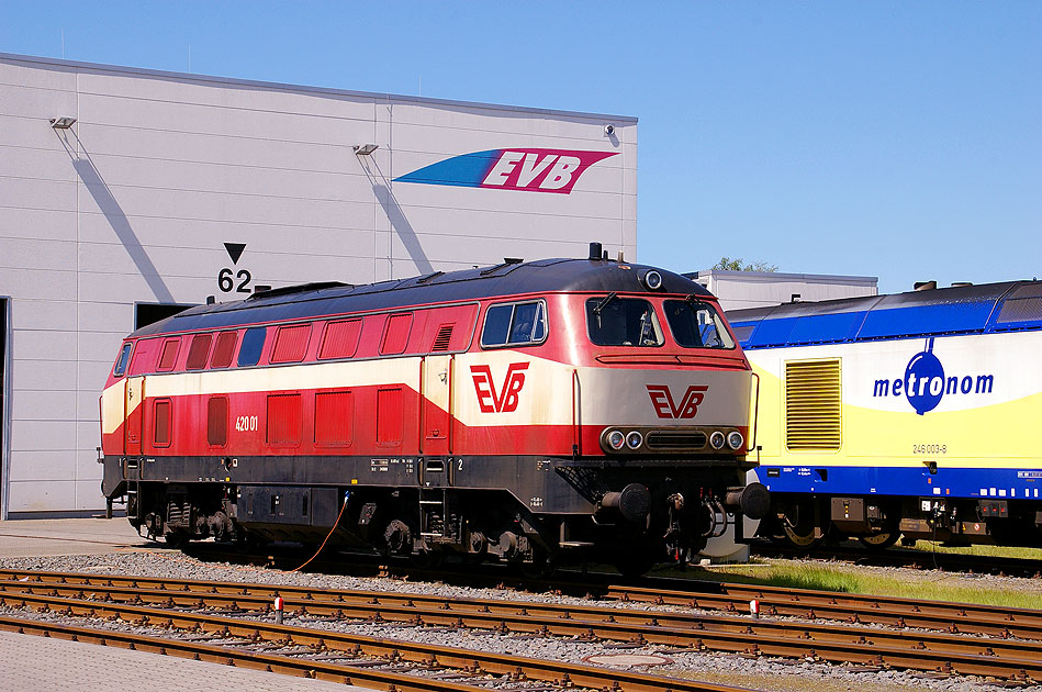 Eisenbahn Fotos auf dieser Webseite: Am 23. Mai 2009 steht die EVB-Lok 420-01 im EVB-Betriebswerk Bremervörde. Hierbei handelt es sich um die ehemalige Bundesbahn V 169 001 und spätere 219 001-5. Digi Foto: IMGP1825.JPG Digi Fotos: 0188 Foto: Lars Brüggemann Diese Seite ist ein Teil einer Online-Foto-Sammlung ähnlich einem Bildband, Sie können sich hier von Baureihe zu Baureihe durchklicken. Vielleicht suchen Sie aber Fotos für eine Heimatchronik, ein Fachbuch oder einen Fachartikel? Schreiben Sie mir! Email an Lars Brüggemann: mail@larsbrueggemann.de Dieses Angebot richtet sich nicht an bildersammelnde Eisenbahnfreunde zur kostenlosen Zusendung (für "private Zwecke"). zurück zur: Startseite |