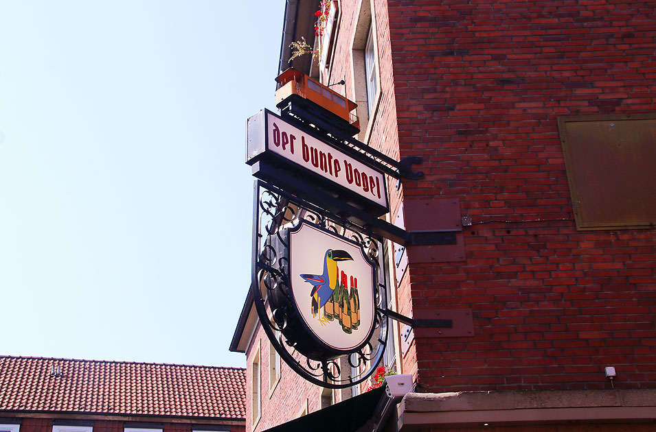 Mit Elektromobilität durch Münster: Die Gaststätte "der bunte Vogel" in Münster erinnert noch heute an die Straßenbahn, über dem Schild vom bunten Vogel "fährt" eine Straßenbahn. Bis 1986 hiess diese Kneipe auch noch "heulende Kurve". Der Name heulende Kurve hat ihren Ursprung bei der Münsteraner Straßenbahn. Zwischen Servatiiplatz zum Prinzipalmarkt fuhren die rote und gelbe Linie durch die besonders enge - heulende Kurve, die zwischen dem Erbdrostenhof, Altem Steinweg und Salzstraße war. Digitalfoto: IMG_4429.JPG Digi Fotos: 0311 (D26/D8/#19) Foto: Lars Brüggemann https://www.buvo.de |
