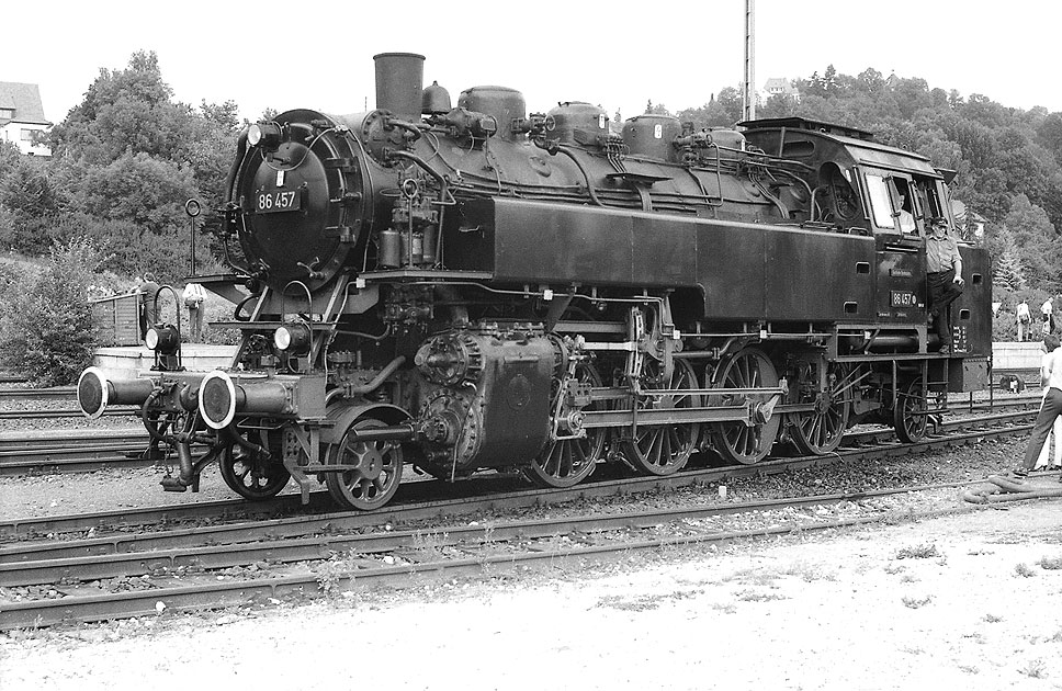 Die Bundesbahn Dampflok 86 457 im Sonderzugeinsatz beim Wasserfassen im Bahnhof Hersbruck rechts der Pegnitz im Juli 1985. Die Lok fuhr Anlässlich der Feierlichkeiten 150 Jahre Eisenbahn in Deutschland. Foto: f47-t55-1985 FP3 Foto: Lars Brüggemann Interner Vermerk: Dieses Foto ist noch unter einem anderen Dateinamen online. |