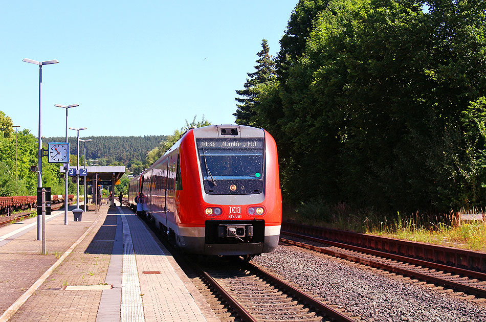 Im Bahnhof Pegnitz steht der 612 061 RE (Regional Express) nach Nürnberg Hbf und wartet hier auf einen weiteren Flügelzug auf die Weiterfahrt nach Nürnberg. Digi Foto: IMG_6441.JPG Digi Fotos: 0382, FP10 (D1/D7/darya25) Foto: Lars Brüggemann |