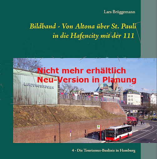 Bildband - Von Altona über St. Pauli in die Hafencity mit der 111 - 4 - Dieser Bildband von Lars Brüggemann zeigt eine Fahrt mit der Buslinie 111 in Hamburg entlang zahlreicher Sehenswürdigkeiten. Die Buslinie 111 in Hamburg bietet eine Stadtrundfahrt durch Hamburg zum Tarif des Hamburger Verkehrsverbunds (HVV). Die Fahrt in diesem Bildband beginnt am Bahnhof Altona, führt durch St. Pauli, vorbei an den Landungsbrücken und endet in der Hafencity dabei wird jede Haltestelle vorgestellt. Dieser Bildband ist etwas für alle Hamburger und Hamburg-Besucher und insbesondere für Busfreunde. Die Bildtexte erläutern die Fotos und geben zusätzliche Informationen. Auf 70 Seiten mit 75 Fotos erhält man so einen umfassenden Eindruck über eine der schönsten Buslinien in Hamburg. Ideal ist der Bildband auch um nach einem Hamburg-Besuch die Fahrt in der Linie 111 Zuhause noch mal zu erleben. Bildband - Von Altona über St. Pauli in die Hafencity mit der 111 Books on Demand Preis 17,90 Euro ISBN 9 783 739 220116, Paperback, 70 Seiten, 75 Fotos Bildband - Von Altona über St. Pauli in die Hafencity mit der 111 Im Buchhandel und Online-Buchhandel erhältlich Auch als Ebook im Online-Buchhandel und direkt beim Verlag |