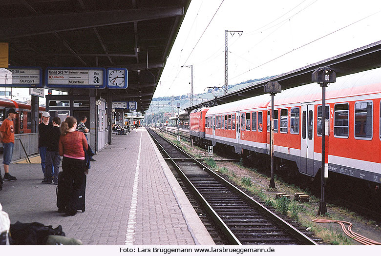 Auf dem Bahnsteig an Gleis 3 in Würzburg Hbf, aufgenommen am 3. Juni 2005. Rechts im Bild ein Silberlingszug bespannt mit einer Lok der Baureihe 143. Dia 9155-2 Foto CD 026 Foto: Lars Brüggemann |