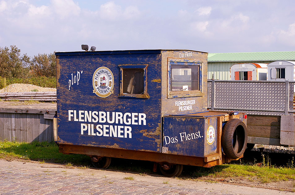 Die Halligbahn vom Festland in Dagebüll über Oland nach Langeneß durch die Nordsee in Schleswig-Holstein. Hier steht in Dagebüll eine Lore mit Werbung für Flensburger Pilsener. Das "Bahnbetriebswerk" der Halligbahn in Dagebüll erreicht man fussläufig von der Mole über den Deich südwärts in etwa 10 bis 15 Minuten. Digi Foto: IMGP6470.JPG Digi Fotos: 0178, FP1 (D20/D9/#+08) Foto: Lars Brüggemann Facebook-Seite Dagebüll Mole Fotos von larsbrueggemann.de |